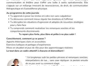 Si la prévention, le dialogue… n’ont pas fonctionné, il se peut que l’on est à se défendre physiquement. L’atelier propose de s’entraîner à quelques techniques simples pour rester à distance, à se dégager rapidement et à se libérer d’une prise